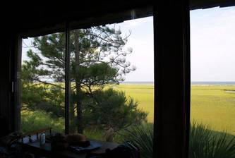 There is a queen sleeper sofa in the TV area on the main level. A Large deck is accessed from the sitting area and faces the ocean. There is a full bath on the first level, a medium kitchen and a large dining area. A 35 foot covered porch overlooks the Creek and the entire front of the house is glass, facing the ocean. Screens on the porch and decks are not necessary because the bugs don't come there, the height and full time breeze keep them away.